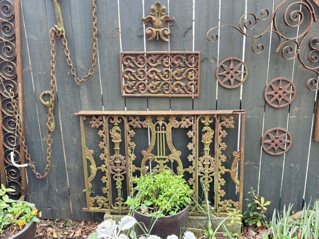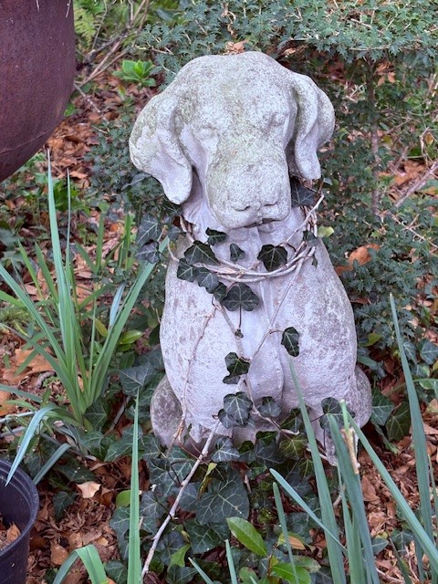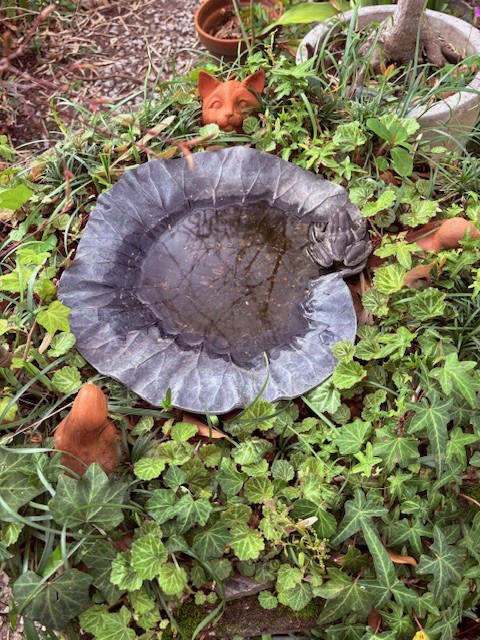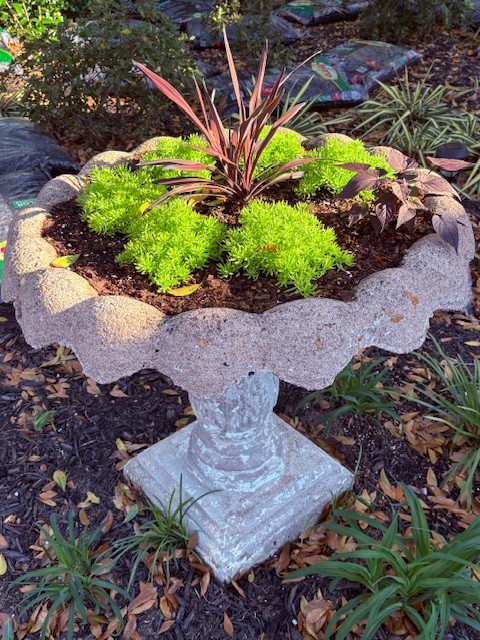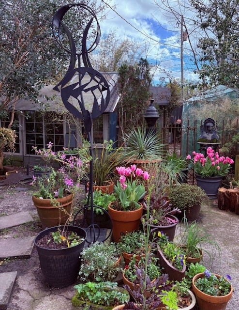 This garden is a place of intention & pleasure, filled with plants the homeowners find beautiful, useful or delicious, alongside those that have simply decided to grow here and have earned their spot. We favor plants that thrive without fussing, because gardening is about much more than work. Scattered among the greenery & flowers is a collection of found objects kept for memory, beauty or pure strangeness, yard art in the truest sense. The garden also serves as a habitat: birdbaths & feeders, water for stray cats, nectar plants for bees & butterflies. Gardening here since the mid-1980s, the homeowners have followed and guided this space through many lives – from neglected yard to leveled ground with stone walls, and the most recent change: Hurricane Helene which took trees and tall shrubs from the side yard, stripping away years of privacy and shade. Now it’s full sun and open sky which has meant new, real curtains for the house and a new vision for that part of the yard. This upheaval, though, is exactly what makes gardening spiritually profound. Trees grow and cast shade where there was none. Trees fall and suddenly the light returns. Plants bloom and die; seedlings grow to flower or fruit; something planted today won’t bear fruit for years. Through all of it, the natural world continues around us: birds nesting, butterflies drifting, bees at the water’s edge. As we participate in this process, the garden nurtures us back, connecting us to the quiet, peaceful awe of nature. We are so happy to share it with you.